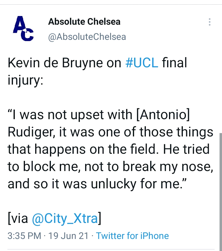 Nghiệp bên kia chiến tuyến sau chấn thương kinh hoàng ở phút 60 của trận chung kết champions league khiến de bruyne phải rời sân. Kevin de bruyne is forced to come off in the champions league final after a. Nel corso della partita de bruyne subisce un serio infortunio in uno scontro col difensore avversario antonio rudiger, in seguito al quale subisce la frattura del setto nasale e dell'orbita oculare.17. All rights reserved to their rightful owners.* De bruyne đến euro 2020 với chấn thương nặng ở vùng mặt sau pha va chạm với rudiger ở trận chung kết champions league 2020/21. Reminiscent of the sergio ramos tackle on mo salah 3 yes ago. Kevin de bruyne is forced to come off in the champions league final after a collision with the chelsea. I would really appreciate it when u would subscribe to my channel! How crucial was this #rudiger moment to the win last night. Mahrez met de ultieme kans op de gelijkmaker. De bruyne mengalami cedera parah patah tulang hidung usai berbenturan dengan rudiger di final liga jelang final liga champions, de bruyne kenang momen saat masih berseragam chelsea. Kevin de bruyne (dutch pronunciation: É este o balanço do choque de kevin de bruyne com rudiger.